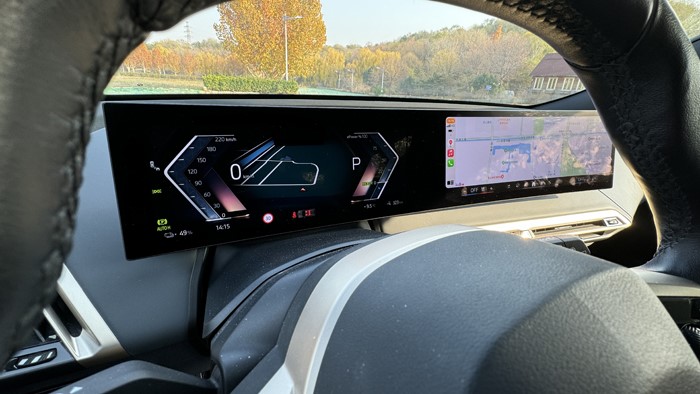 坐在車?yán)锟梢愿惺艿胶?jiǎn)潔和溫馨,寶馬歷史上首次使用的6邊型雙輻方向盤造型前衛(wèi)。方向盤按鍵數(shù)量被控制在合理的范圍,帶有振動(dòng)反饋設(shè)計(jì)配合大面積的按鍵很容易上手。12.3英寸液晶儀表和14.9英寸中控屏結(jié)伴出現(xiàn),組成曲面雙連屏。中控臺(tái)向左傾斜6度,便于駕駛員操作。