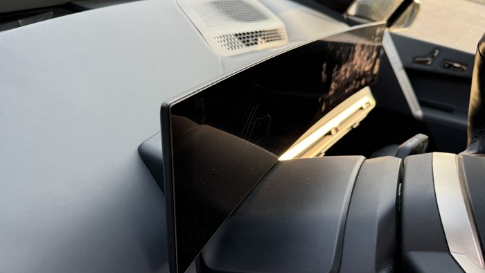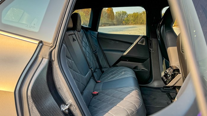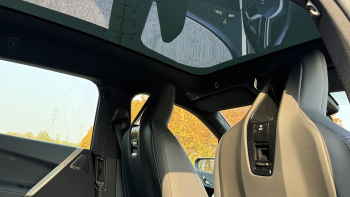 iX有著比寶馬X5更長(zhǎng)的車長(zhǎng)(4955mm)和軸距(3000m),加之純電平臺(tái)帶來(lái)的純平地面以及寬大的坐墊,后排乘坐體驗(yàn)無(wú)需擔(dān)憂。后排座椅同樣是軟軟的,兩側(cè)還有打孔菱形設(shè)計(jì)的軟質(zhì)材料一直包覆至車門的開口,這更像是一張環(huán)繞式的大沙發(fā)。得益于高強(qiáng)度碳纖維車頂橫梁的應(yīng)用,一體式大玻璃車頂在iX身上成為了可能,這也是目前天窗面積最大的寶馬車型。與其說(shuō)是全景車窗,這塊大玻璃更適合稱作全景天幕,不能開啟通風(fēng),但能提供極佳的光線和開揚(yáng)感。此外,這塊大天幕還帶有類似波音787上舷窗的電子控制透光率功能,通過(guò)內(nèi)后視鏡后方的觸摸按鍵可以實(shí)現(xiàn)分級(jí)調(diào)節(jié)透光率,且具有優(yōu)秀隔音隔熱性能。