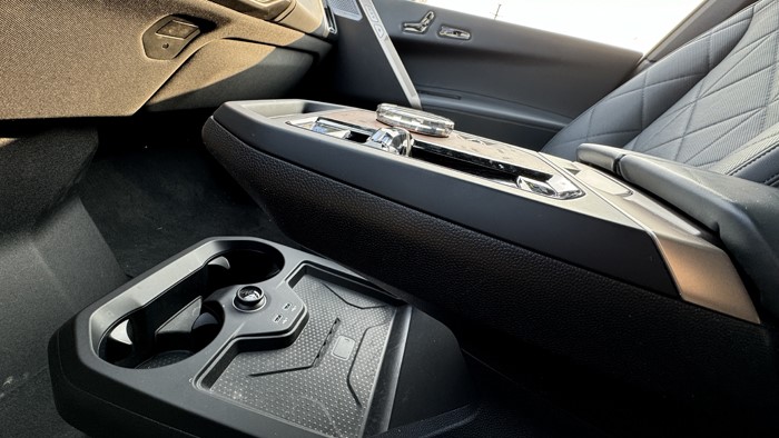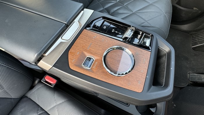iX的前排扶手上集成了電子換擋機(jī)構(gòu)以及iDrive的控制界面,多媒體屏幕本身帶有觸摸功能,但寶馬還是執(zhí)著地保留了iDrive的旋鈕和按鍵。充滿清新風(fēng)格的iDrive控制區(qū)采用了實(shí)木裝飾,旋鈕采用水晶材質(zhì),木板上的文字按壓操作手感非常好。下方的平臺(tái)除2個(gè)水杯架外還留有手機(jī)無(wú)線充電。
