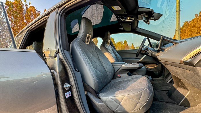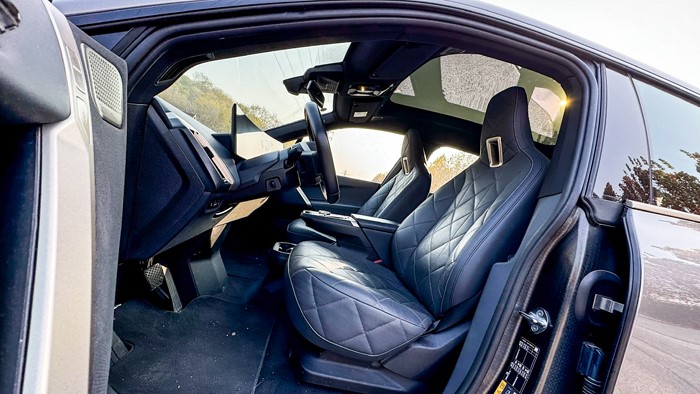 打開iX的電尾門,后備廂內(nèi)側(cè)門邊帶有示寬燈,能起到給予后方車輛警示的作用。第二排座椅支持“4:2:4”比例放倒,靠背放倒后也基本能和后備廂底板形成一個(gè)平面,后備廂內(nèi)部空間非常規(guī)整。打開車門,可以看到車門內(nèi)框的碳纖維車架,寶馬稱之為Carbon Cage碳纖維籠式車架,iX是第一款用上這種結(jié)構(gòu)的寶馬車型,在車架強(qiáng)度以及輕量化上取得了很好的平衡。車尾門的框架以及車頂前方的橫梁也都為碳纖維結(jié)構(gòu)。