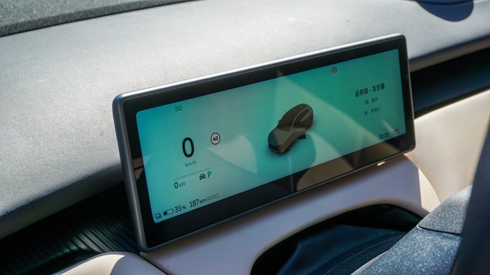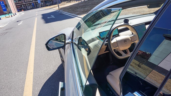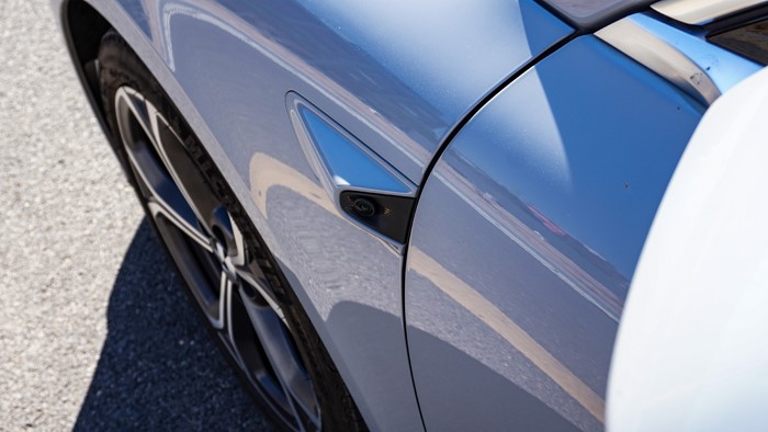 隱藏式門把手是時(shí)下純電轎車標(biāo)配的設(shè)計(jì),能夠降低一定的風(fēng)阻系數(shù)。當(dāng)你走近,門鎖會(huì)自動(dòng)彈起,反應(yīng)速度還是很不錯(cuò)的。