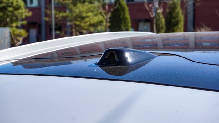 車身頂部、翼子板、前后杠及外后視鏡等區(qū)域均設(shè)計(jì)有雷達(dá)及攝像頭,為安全行車提供保障。