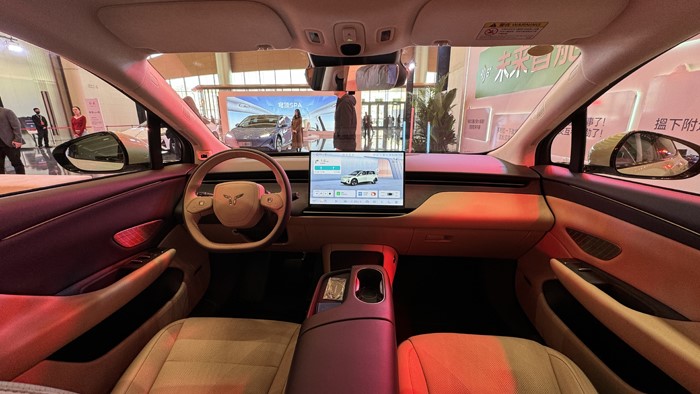 天工06的中控臺(tái)表面采用麂皮包裹,中控臺(tái)上有一塊懸浮式的中控屏,取消了傳統(tǒng)的實(shí)體儀表盤,取而代之的是巨大尺寸的HUD抬頭顯示。整體內(nèi)飾做工細(xì)膩,并且沒有新車的異味,可以看出環(huán)保用料非常到位。