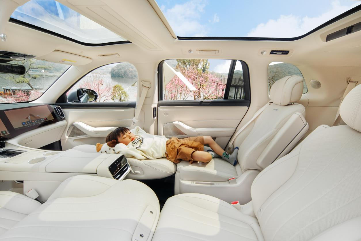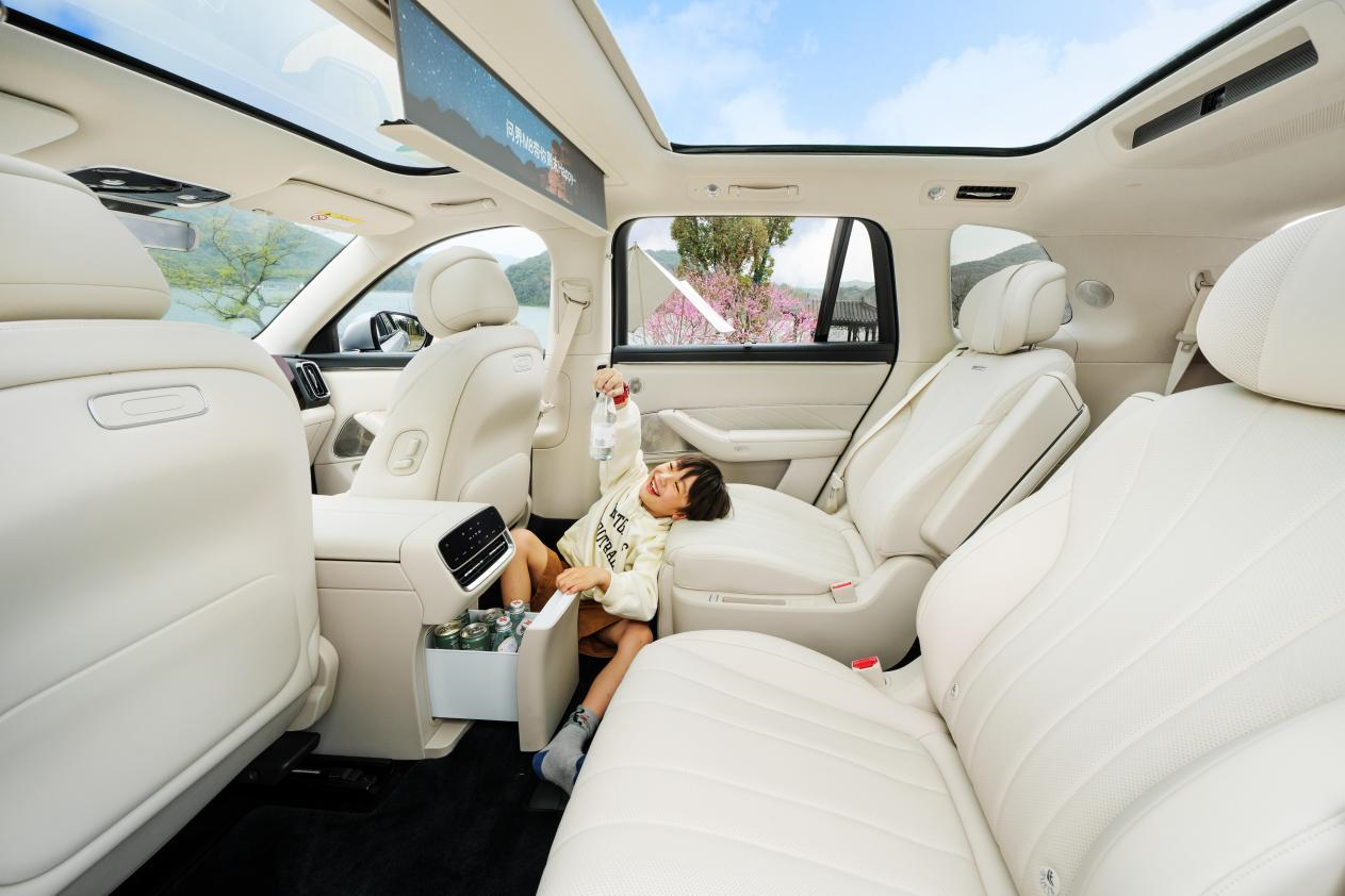 在儲物能力方面,六座版全車多達(dá)41處儲物空間,展現(xiàn)極致巧思。后備箱常規(guī)容積353L,如果放倒三排座椅,后備箱空間可以拓展至1284L,并且還擁有39L暗格。再加上二排按壓自動彈開的杯托、CNSL下方的鏤空儲物空間等設(shè)計,真正實(shí)現(xiàn)了對空間的極致利用。五座版標(biāo)準(zhǔn)容積976L,二排放倒后拓展至2348L,可容納沖浪板或折疊自行車。另外,五座版二排還配有9L百寶箱,可以將紙尿褲、游戲手柄等零碎物品歸置有序。