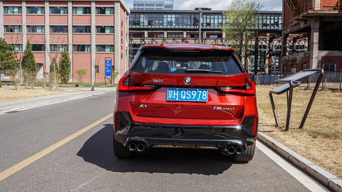 車尾正后方可以看出寶馬X1 M35Li上下比例更加均勻一些,奔馳AMG GLB 35則是上窄下寬的樣式。但總體看上去,兩臺車都不是“善茬”。