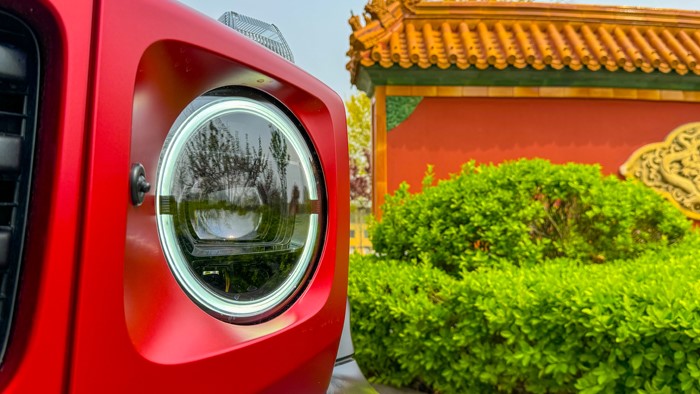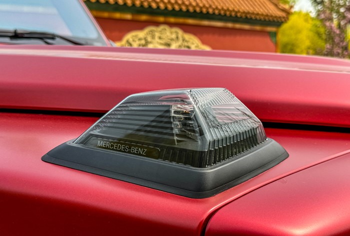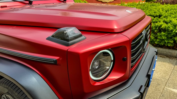 帶有暗夜套件的中網(wǎng)及前黑色保險杠形成了雙拼配色,非常明顯。從這一代奔馳G開始,奔馳G一直以來所堅持的“方正”造型演繹出了細(xì)微的變化,前保險杠不再是一條直線,兩側(cè)變得略微后掠。