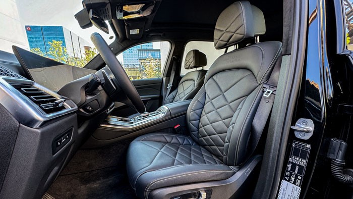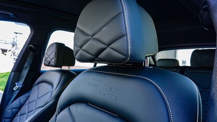 這臺(tái)X5的座椅使用黑色真皮與檸檬綠色壓線,配色高級(jí)且讓人眼前一亮,座椅靠背上也燙印了黑焰限量的徽章。乘坐感受上你會(huì)覺得柔軟與舒適,很有沙發(fā)的感覺。主/副駕駛座椅帶有14項(xiàng)電動(dòng)調(diào)節(jié)并帶有座椅通風(fēng)加熱。