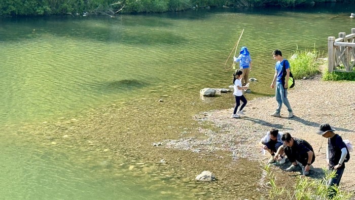 在水邊看到很多小蝌蚪,有的人玩水,有的人靜靜地發(fā)呆,大人孩子都找到了屬于自己的快樂。