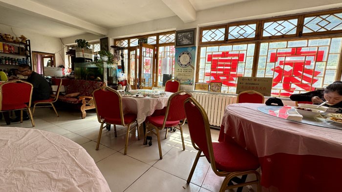 這是一個(gè)典型的北方小鄉(xiāng)村,街道干凈整齊,一排排的紅瓦磚房,大多數(shù)院落都開起了農(nóng)家特色餐飲。來往的游客很多,還有不少旅游大巴和自駕游摩托車隊(duì),很是熱鬧。