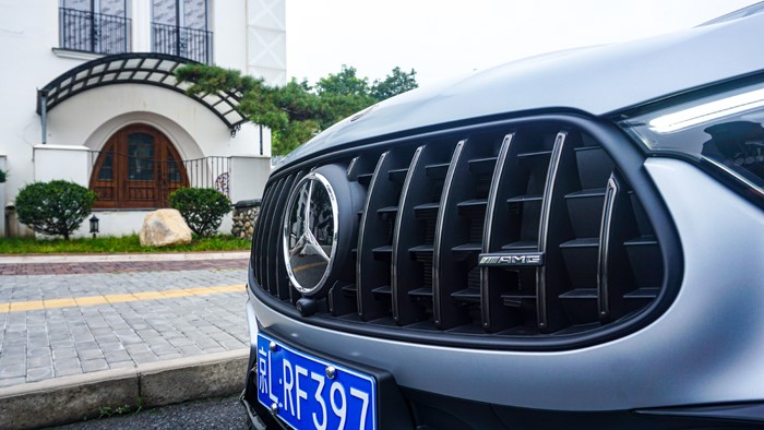 前臉采用了AMG直瀑式進氣格柵和熏黑的LED大燈組合,展現(xiàn)出強烈的力量感。引擎罩上鑲嵌了AMG的徽章,很有辨識度。