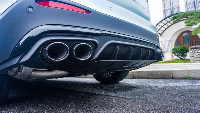 車型后部設(shè)計簡潔而精致,同樣是全面黑化處理。熏黑LED尾燈的設(shè)計使整個車尾更加立體感十足。后備箱非常平整,支持4/2/4分別放倒。后杠下方的空氣套件讓車看上去非常戰(zhàn)斗,另外車輛使用了雙邊雙出排氣。