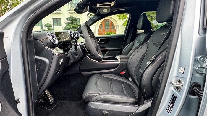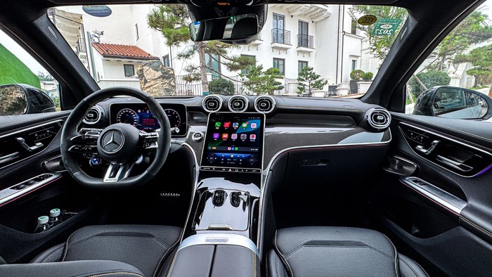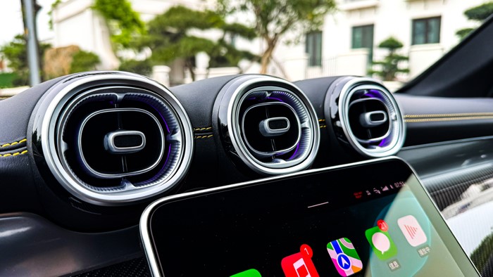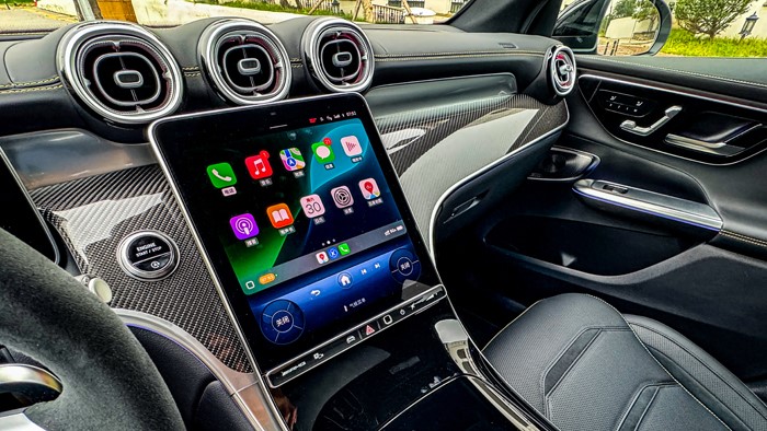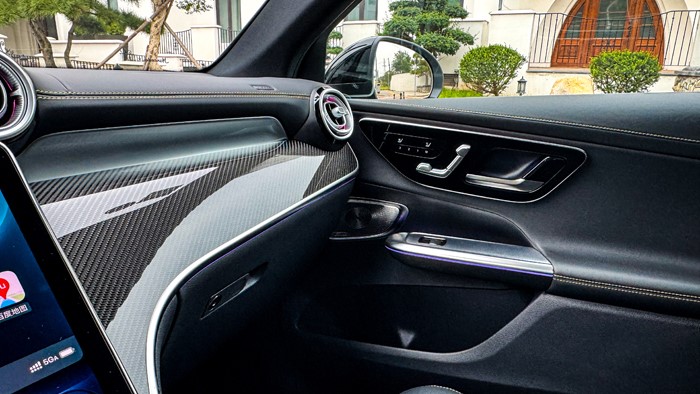 進入車內(nèi),奔馳2025款 AMG GLC 43 4MATIC的中控臺采用黑黃配色,加上碳纖維材質(zhì)的運用讓視覺上感覺非常戰(zhàn)斗,細節(jié)方面的處理也顯示出大廠的功底。