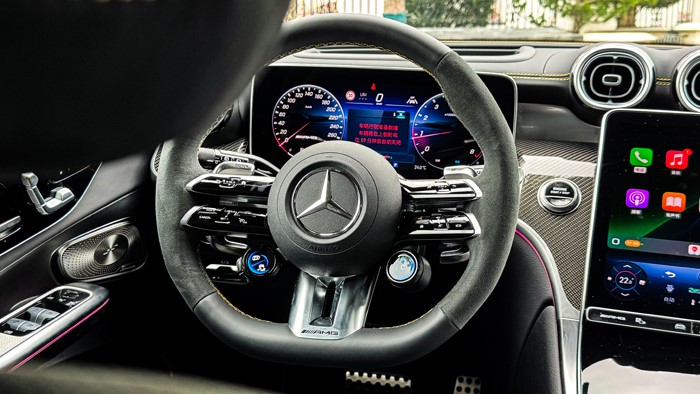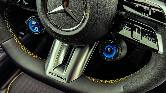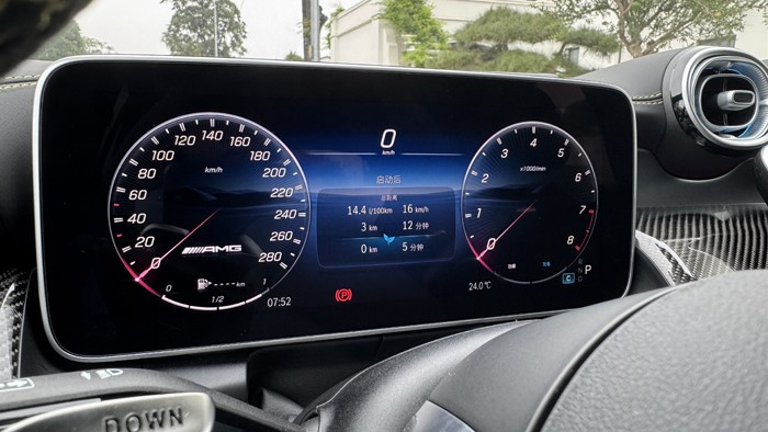 12.3英寸的儀表盤采用全液晶顯示屏,顯示清晰,操作簡便。AMG方向盤選用麂皮與真皮相拼的款式,黃色砸線非常凸顯運動感,握感也很舒適。方向盤上的快速切換單元方便駕駛者隨時轉(zhuǎn)成:戰(zhàn)斗模式。