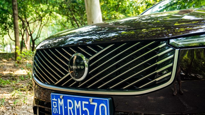雷神之錘的大燈是沃爾沃家族的經(jīng)典設(shè)計語言,中網(wǎng)格柵采用全新交匯的樣式,辨識度非常高。中網(wǎng)邊框采用極窄的風(fēng)格,兩端與車頭大燈交匯,扁平化風(fēng)格很明顯,也使車頭看上去更寬大了??偟膩碚f新款S90的車頭看上去年輕了不少。