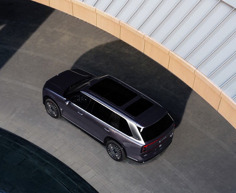 外觀方面,新車造型非常磅礴大氣,前臉大尺寸的亮面鍍鉻中網(wǎng)和009有異曲同工之妙。不過兩側(cè)分體式大燈造型有所不同,沒有采用009折線燈帶設計。日行燈縫線貫穿,搭配矩陣燈組,簡潔大方。而之所以稱之為“杭州灣庫里南”,則是源自于這平直的車身側(cè)面設計,還配備了不小的后三角窗,還配備了22英寸鏡面鍛造輪轂。