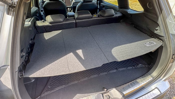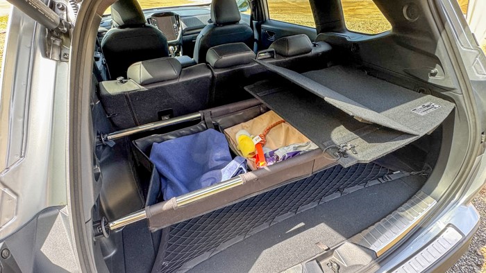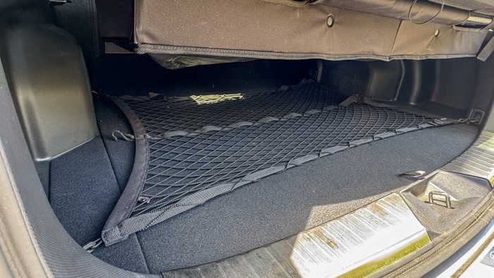后備箱空間非常平整,座椅可4/6分別放倒,形成的載物空間非常平整,放倒后的載物空間可達1666升。特裝版車型加入了懸浮式儲物盒的設計,這也是原廠配件,通過掛鉤可以將隔板抬起,三個儲物格可以放置零食或雜物。隔板承重5公斤,儲物盒下方還配備了固定行李的網兜。當然該系統支持快拆,軟布材質收納也不占空間。