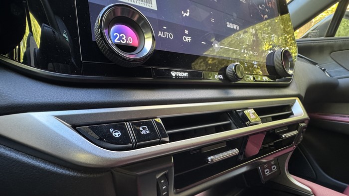 真皮包裹的方向盤手感極佳,皮質(zhì)相當(dāng)細(xì)膩,并帶有F SPORT徽章。多功能按鍵的分布也是清晰明了,觸手可及。