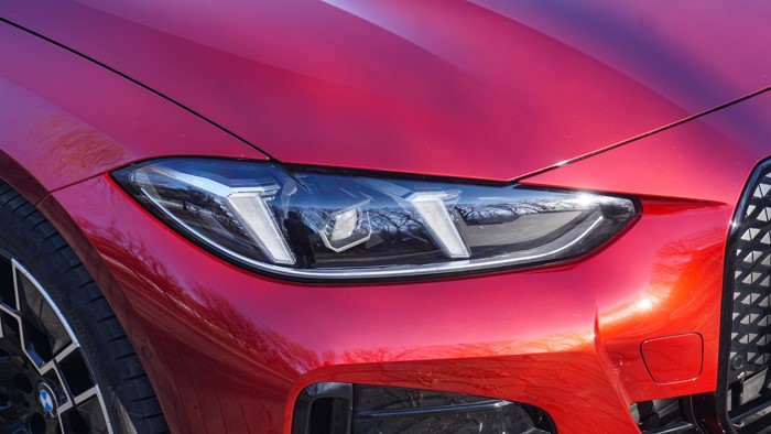 寶馬i4的外觀設(shè)計(jì)是很有視覺(jué)沖擊力的,整個(gè)車(chē)身延續(xù)了寶馬一貫的簡(jiǎn)潔、硬朗的線(xiàn)條感,并加入了充滿(mǎn)未來(lái)感的元素。特別是車(chē)頭部分完美地融入了LED燈光和封閉式雙腎型“進(jìn)氣格柵”的設(shè)計(jì),火焰紅色油漆配合亮黑色套件令人過(guò)目難忘。