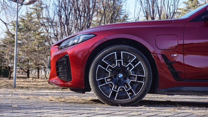 車(chē)輛側(cè)面左前翼子板處增加了充電接口,同時(shí),寶馬i4標(biāo)配的是18英寸半封閉式輪轂,本車(chē)選配了19寸,前輪胎規(guī)格245/45 R19,后輪胎規(guī)格255/45 R19。