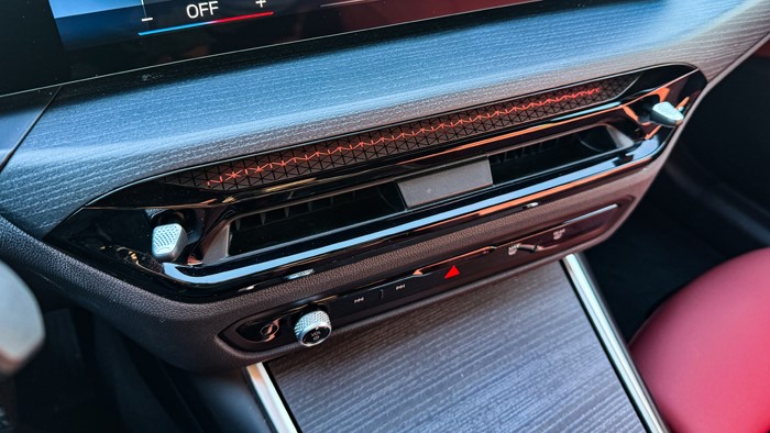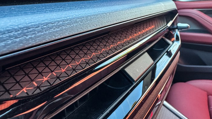 進(jìn)入車(chē)內(nèi),氛圍燈迷幻色彩濃郁,按下啟動(dòng)按鈕,隨之而來(lái)的是一段模擬的類(lèi)似電流接入的聲音,非常像科幻片里那種飛船已就位,待命出發(fā)的既視感。