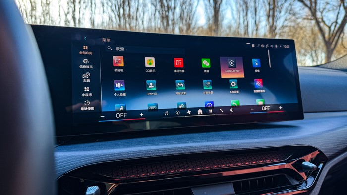 14.9英寸、12.3英寸的雙聯(lián)屏組合讓車(chē)內(nèi)的科技感很足,屬于電車(chē)的那份電味兒設(shè)計(jì)也很濃郁。iDrive車(chē)機(jī)系統(tǒng)除了流暢度非常高之外,附帶的功能APP也非常多。