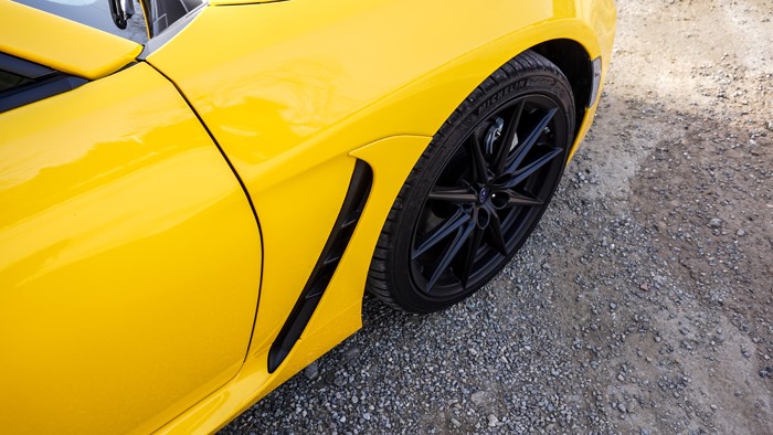 各個(gè)角度都能讓你感覺(jué)到運(yùn)動(dòng)、精巧、動(dòng)感,18寸啞光黑色STI鋁合金輪轂也是很顯品味。輪胎規(guī)格為215/45 R18。