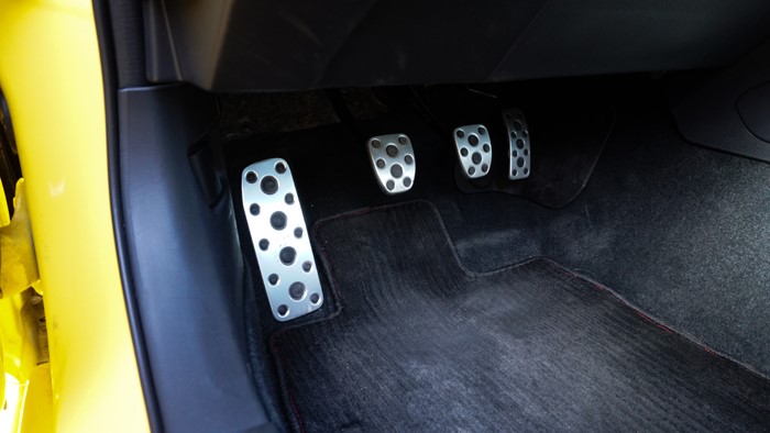 無(wú)框玻璃門是必不可少的設(shè)計(jì)元素,鋁合金運(yùn)動(dòng)踏板讓人很是喜歡。中控臺(tái)這塊多媒體屏幕很是有懷舊的感覺(jué),斑斕的陽(yáng)光灑在中控臺(tái)上時(shí),讓人感覺(jué)回到了JDM最輝煌的年代。當(dāng)然限量版的徽章也出現(xiàn)在換擋桿前方,情緒價(jià)值拉滿。