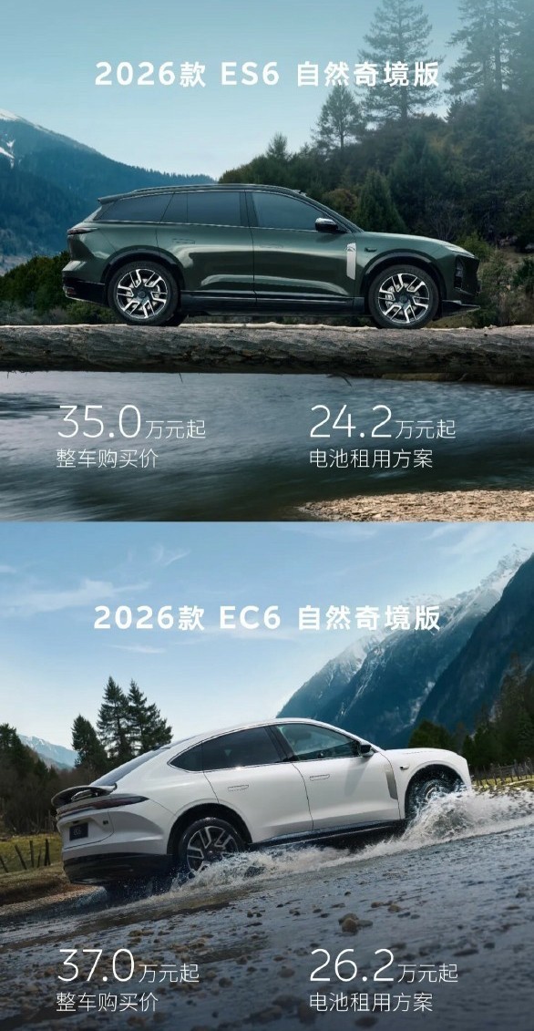4月2日,2026款蔚來ES6/EC6正式上市,整車售價(jià)分別為33.8萬起、35.8萬起;另外還推出自然奇境版,售價(jià)分別35萬起、37萬起。